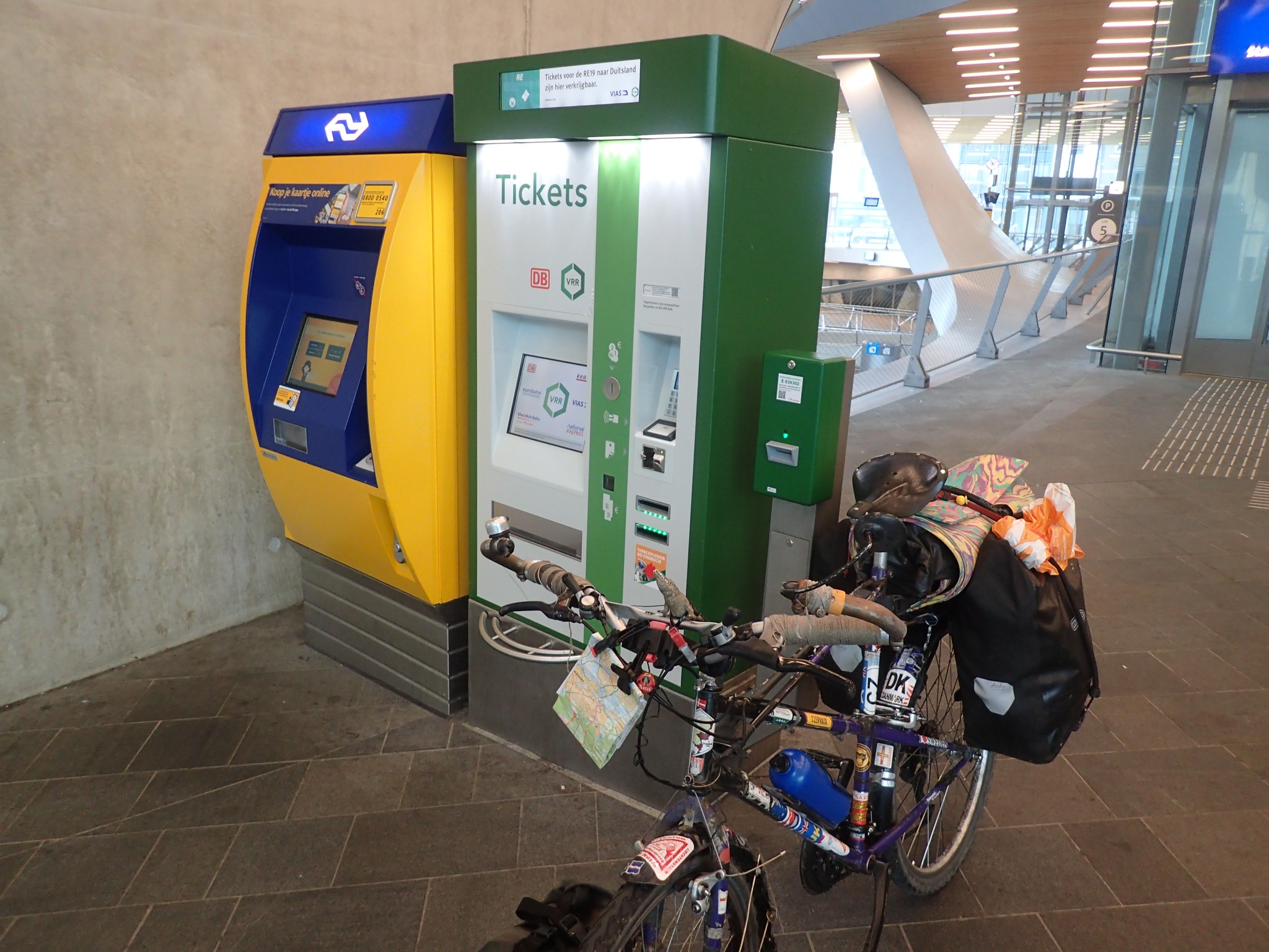 Pentru a ajunge in Germania cu trenul din statiile olandeze apropiate de granita, Andrew a folosit automate de bilete verzi ale Deutsche Bahn (DB). Totul poate fi rezervat usor acolo, inclusiv in limba engleza. Pentru bicicleta, a fost nevoie de un bilet de o zi, in valoare de 5,50 euro, plus un bilet pentru destinatia sa. Daca pretul calatoriei depaseste 60 de euro, Andrew recomanda achizitionarea unui bilet "Quer Durch Land", care este o afacere buna pentru grupuri de 2 pana la 5 persoane, permitandu-le sa calatoreasca nelimitat intr-o zi in Germania, cu exceptia trenurilor IC si ICE.