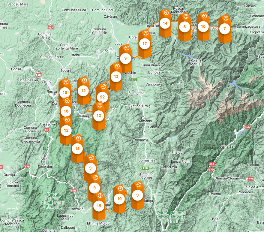 Via Transilvanica străbate Banatul Montan, intrând prin Poarta de Fier a Transilvaniei în județul Caraș-Severin și traversând „țara Gugulanilor”. Acest traseu pitoresc trece prin sălașele munților și dealurilor Parcurilor Naționale cu păduri seculare, întâlnește râul Nera și canalele de captare a râulețelor de munte, vechi și acoperite de mușchi verde, creând un peisaj electrizant și revigorant.